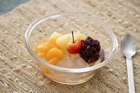 Postre frío con gelatina de agar, frutas, anko y sirope dulce.