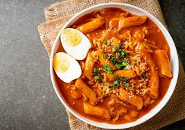 Tteokbokki: Plato coreano de pasteles de arroz cocinados en salsa picante de gochujang.
