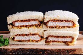 Katsusando: Sándwich japonés relleno de tonkatsu (cerdo empanado y frito), col y salsa dulce-salada, servido en pan de molde suave.